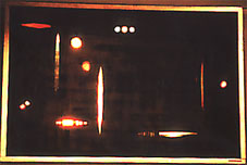 The French critic Michel Conil-Lacoste described the first impression and the functioning of a mobile electro-painting with on-off lights entitled ” Jazz ” as follows : ” Onze alignements d’yeux, correspondant chacun à une source lumineuse colorée qu’allume ou occulte périodiquement un minuscule interrupteur thermique “. The functioning of this kind of picture can easily be calculated and gives 2048 possible combinations (2 to the 11th power) with its corresponding aesthetic effect. This is an important stage in Malina’s desire to arrive at almost infinity in the possible combinations he is proposing to the spectator and in reproducing the life rhythm in his pictures. This is the first picture of Malina where the technical research and the subject-matter is equally matched by a new and surprising aesthetic effect that, while still bearing a definite relatedness with the world we live in, opens up a vista of another, Malina’s particular world. (Here)