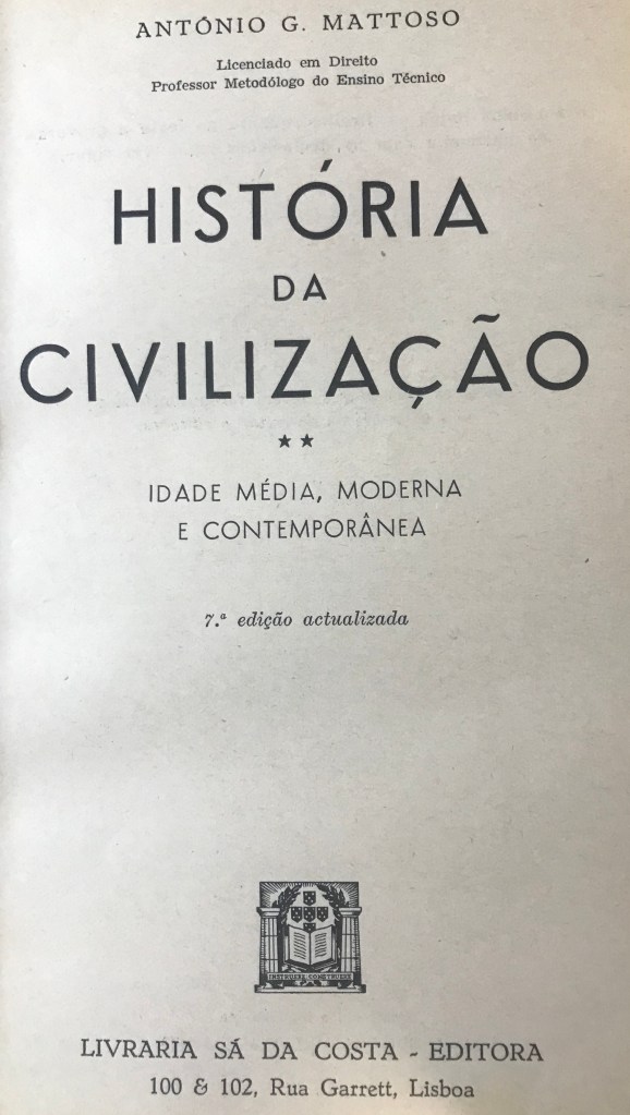 Livro fascinante, para um leitor como eu, logo após o Fischer-Spassky de 1972. Esta edição (1967), igualzinha à que adquiri em 2a mão ao Senhor Gonçalves, tem quase o mesmo encanto.Edição de 1938. Não me recordo de, no meu tempo do liceu, termos seguido obra semelhante.O “velho” Mattoso… Esta obra é de 1959. Ainda recordo páginas inteiras dos seus livros de história que tive de “marrar”… Leio-o agora com menos rancor.Ensino alegre do francês, que nos chega de 1938. Muito simpático!